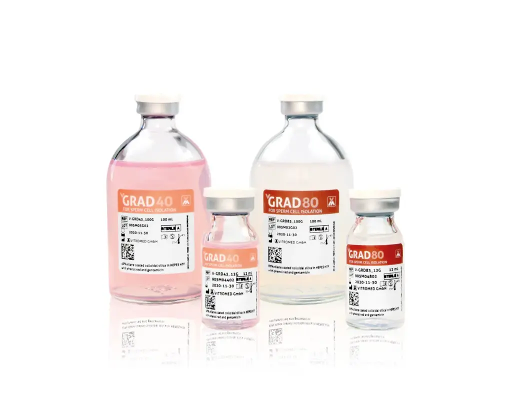 V-GRAD is a sterile colloidal suspension of silica particles stabilized with covalently bound hydrophilic silanes used for sperm purification.